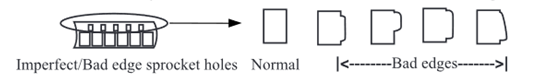 A: Your film may have been played on a projector too many times, causing the sprocket holes to become worn. Some of them may not be rectangular (see picture below). In cases like this, each frame of the film is anchored in a slightly different location at the Light Table of the MovieMaker-Pro, which causes jittery video as a result. You can forward the film first, and record/convert the film while the film winds backward (using the good edge of sprocket holes to advance the film and record the film in reverse). Then play video backwards to convert/save the video. Many video editing programs have a reverse feature that can be used on the file to play in the correct direction.