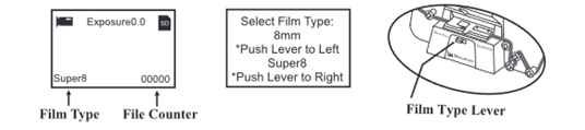 1. Slide the Film Selection Lever to the left (8 mm) or right (Super 8) to select proper film type. Then press the Enter button.