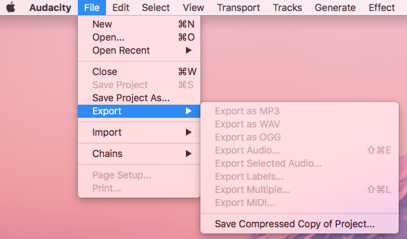 • Audacity export menu
