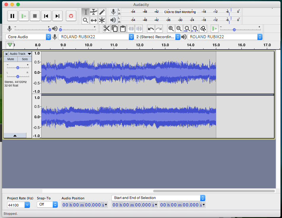 • Tip: It is a good idea to record 15-30 seconds, then save and play back your file to ensure the audio levels are where you want them to be. You may then adjust the volume in Audacity to your liking if needed.