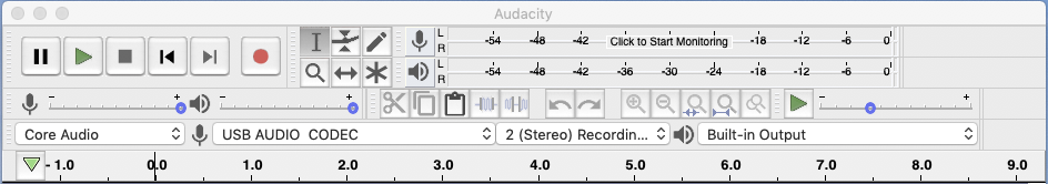 • Click on the words Click to Start Monitoring displayed over the numbers at the top of the Audacity window.
