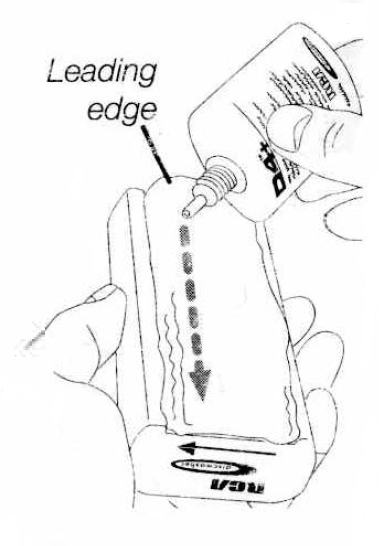 • Application: Apply 3-6 drops of D4+ Cleaning Solution in a line on the leading edge of the record cleaning pad (the arrow on the end of the handle points toward the leading edge). Distribute the solution along the leading edge of the pad using several deliberate strokes with the bottom of the D4+ bottle, forming a strip of damp fabric.
