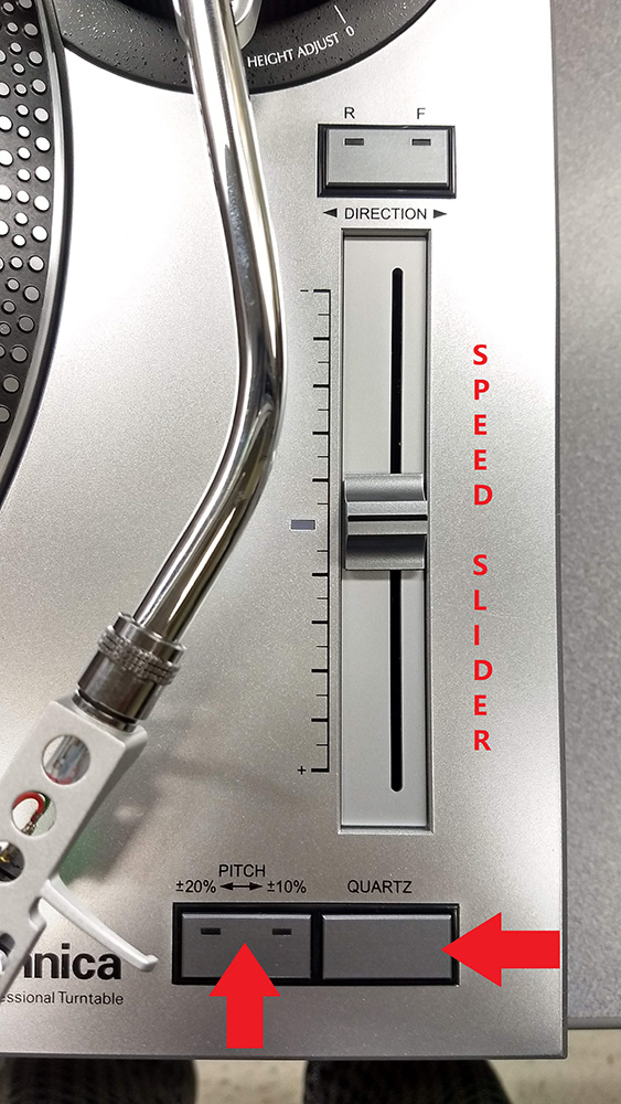 • To change the pitch of the record, press the Pitch control button and use the speed slider control to make the record spin faster or slower than 33 ⅓ rpm. The center position of the slider is set for normal speed playback, but it is best to use the Quartz button for normal speed Quartz-lock playback.
