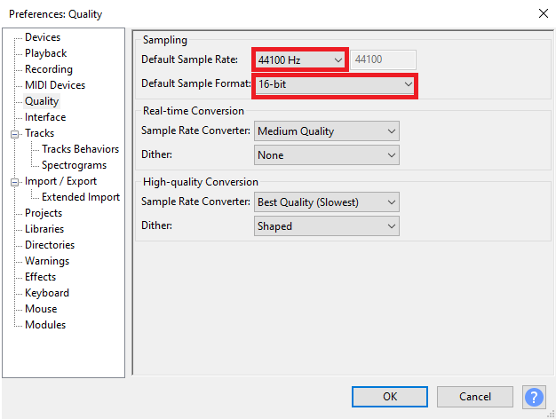 screenshot showing quality preferences on Audacity